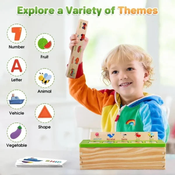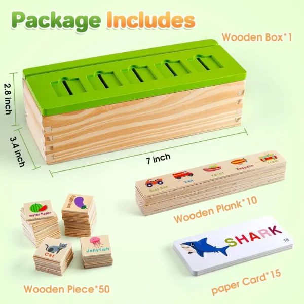 Le coffret comprend des cartes illustrées colorées représentant des objets simples du quotidien, accompagnées de lettres en bois à placer pour former les mots correspondants. Ce jeu renforce l’association image-mot, stimule la reconnaissance des lettres, et améliore la lecture précoce.